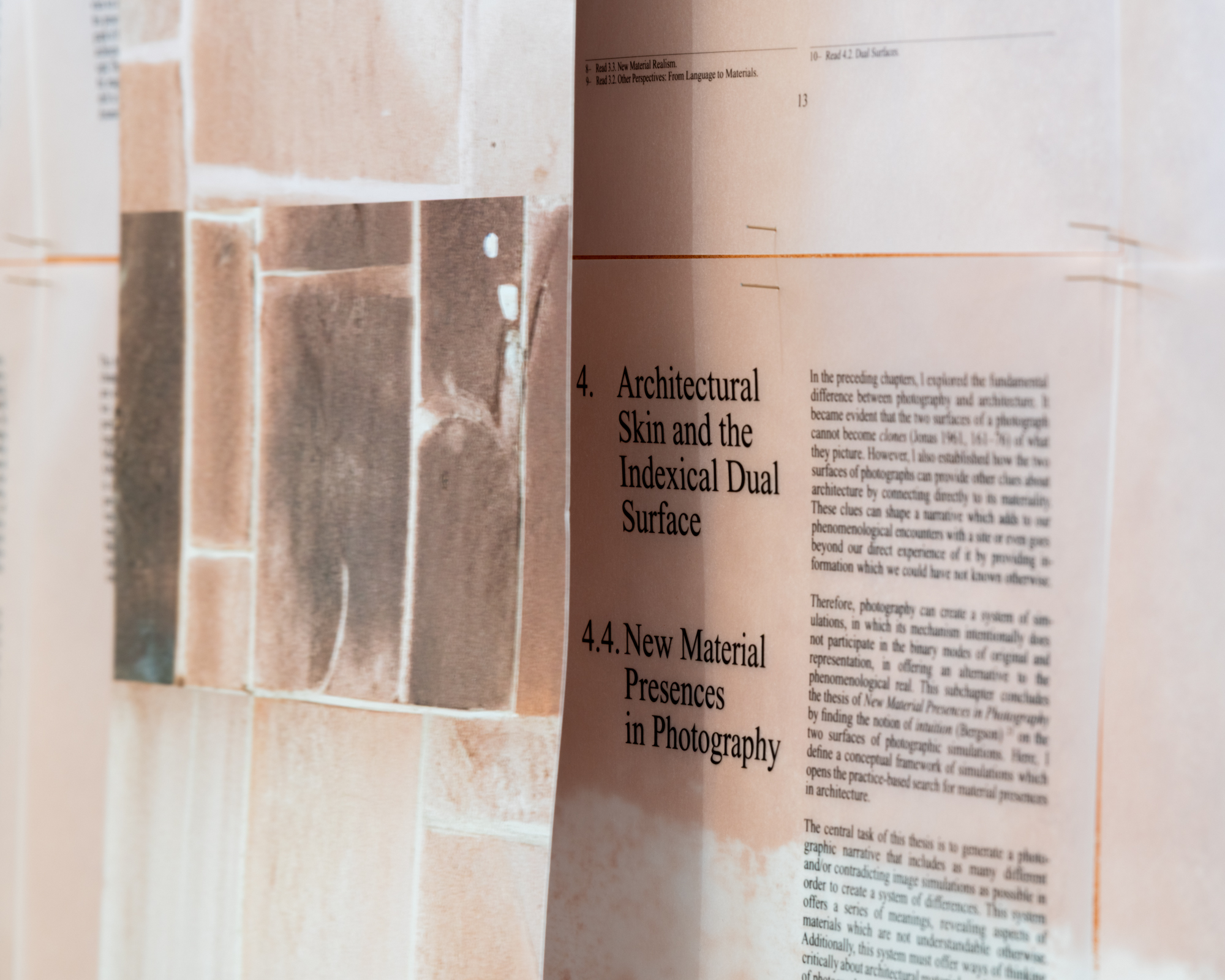 Alongside the written dissertation, a practice-based body of photographic simulations have shaped four installations exhibited during the course of the research. These installations investigate the Degerfelden sandstone used in the Basler Münster as their main case study. Throughout this research it becomes evident that photographs can be considered as entities with two Image and Material surfaces. The Intra-act (Barad 2007, 141) of these two surfaces can shape narratives, which add to our phenomenological encounters and in some cases go beyond our direct experience with architecture by providing information which we could have not known otherwise. This type of material photography can additionally result in breaking the linearity of time, pointing out a coexistence of pasts and presents embedded on the photographic surfaces simultaneously.